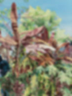 在此次展出的《伊洛瓦底河边的丛林》、《树影婆娑》等作品中,艺术家都大面积、近乎偏执的重复绘画丛林。重复成为一种有意识的绘画手段,对同一物象赋予不同的色彩和形态。艺术家创作图像时,根本已不是以具象的思维来描述物形,也不在意以叙事性方式诠释画面,他反而是一种绘画性、图像性的思维,以抽象化的处理方式描绘水波纹、婆娑树影等,从形体提炼出非常复杂的线条形态、笔势动感,以至色彩的组合关系。《蒲甘泳池的午后》、《露天泳池》看似写实场景,画面严密规划,隐藏着兩种冲突的线条形式:泳池的一道流丽圆弧曲线,对比在画面边缘的林木斑驳、交迭的短促笔触。画面上方的丛林莽莽张狂,有其不可驯服的原始生命力,泳池的曲线以⼀一种强烈的感觉“侵入”画面,仿如工业社会的理性计算与自然世界的混沌未知,激烈冲突。那种人类意识深藏的焦虑和恐惧,甚至是社会与自然的不可调和的冲突,都被艺术家敏锐捕捉住,再以这种带情绪性的构图形式传递出来。